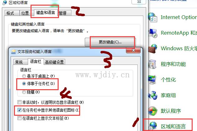 第五步,在接下来弹出的窗口中进行一系列设置,将语言栏,即输入法图标调出来,键盘和语言-->更改键盘-->语言栏-->停靠于任务栏(如上图)