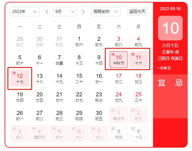 2022年中秋节放假时间安排:2022年9月10日(周六)-2022年9月12日(周一),共放假3天。
