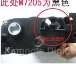6、解锁:将粉盒右侧呈60度扇形的清零复位手柄从右侧用平口改锥撬起搬到左