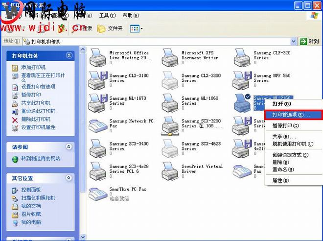3)右键点击【Samsung ML-2160 Series】的打印机图标,选择【打印首选项】。
