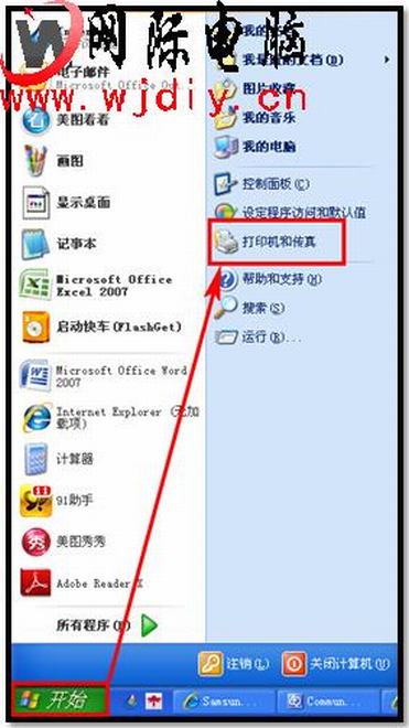 (1)进入电腦左下角【开始】选项,选择【打印机和传真】(Win7系统选择【设备和打印机】)。这里以“Win xp”系统为例。