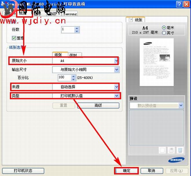 (4)选择【纸张】选项,设置原始大小【A4】、来源【自动选择】、类型【打印机默认值】,最后按【确定】。