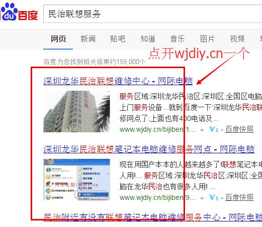 第二步点开上图关键词就是百度页面了;从百度页面结果找到c61.net相关网页;如下图'民治联想服务'